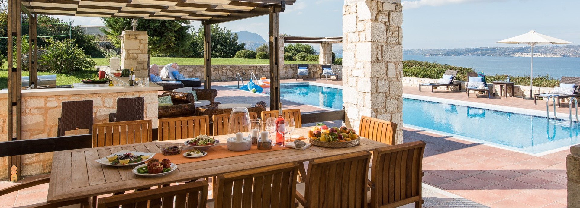 This villa is absolutely stunning. The views are amazing. Everything in the villa is to a high standard. The pool is lovely and the outside areas were perfect for us - we loved the bar and the BBQ and the large grass area to play football or frisbee. We were a family with three teenagers, two parents and a grandmother and the space was perfect for us. We were able to walk up the hill to the local restaurants and shops and also to the local beach (although it is quite steep so not so easy for the grandmother). We were glad to have a car to be able to get further afield on the Island and particularly liked Chania by the harbour and Georgioupoli for the land train up to the lake. Throughout our stay the communication was excellent - friendly and prompt and fixed any problems immediately.